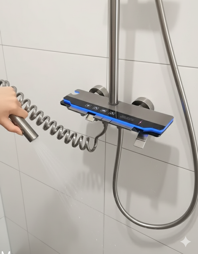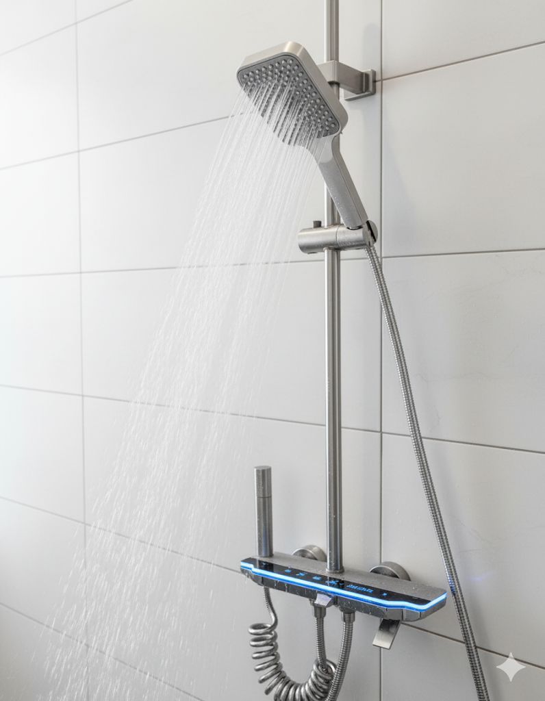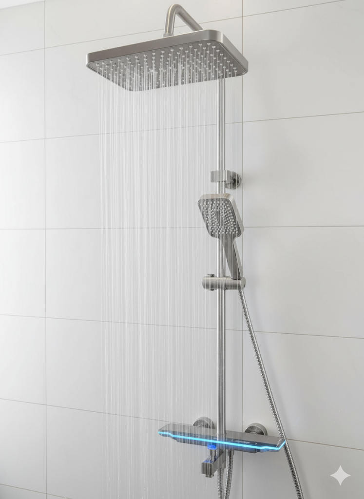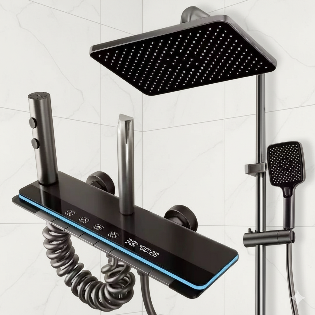 Experience luxury with the Soft Grey Gun Rain Shower. Its single-handle, metered design offers natural rainfall spray, easy control, and 3000L/min water flow.